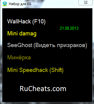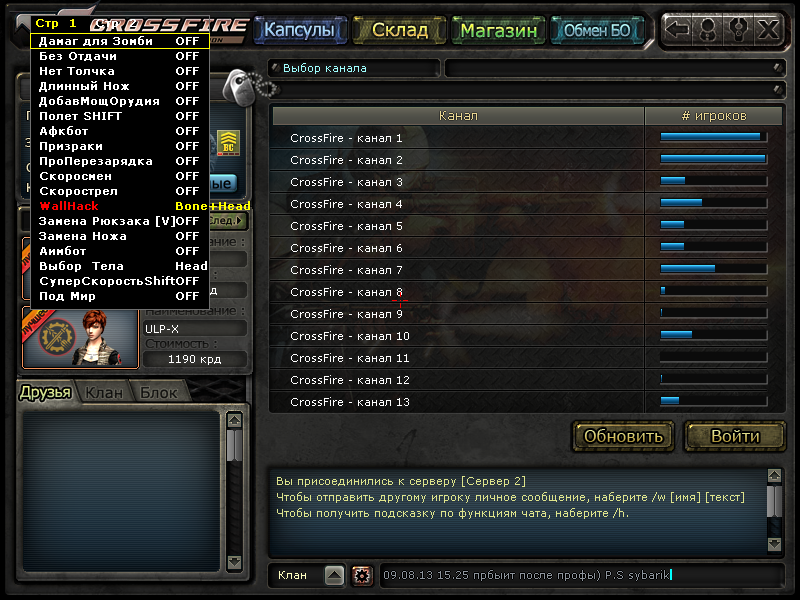 Всем привет!Просьба перекачать!Был небольшой баг з ссылками! Хочу Вас порадовать новым обновленным читом после сегодняшней профы! Старый,добрый HlBot для всех версий CrossFire,этот мегафункциональный чит имеет качественное D3D меню, с всема доступными функциями для КФ, набиваем фраги и радуемся!Новая версия актуальная на 19.08.2013.! Чит рабочий 100%.